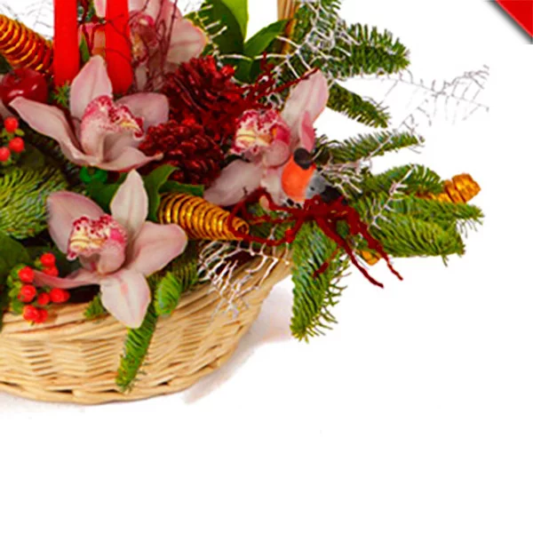 Эффектная новогодняя корзина в ярких красках, очаровательные цветы орхидеи поразят Вас своим изяществом.