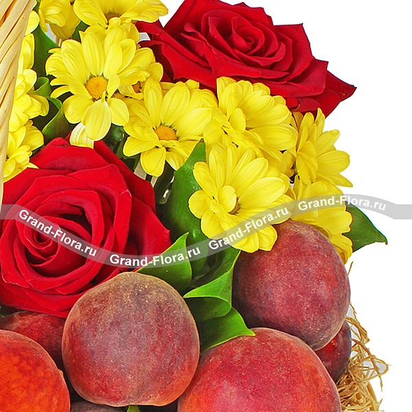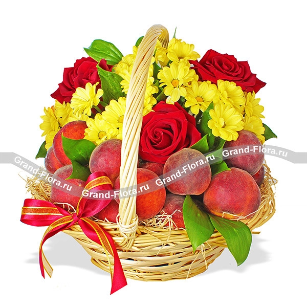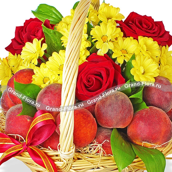 Стандартный (как на фото): роза красная - 3 шт., хризантема желтая кустовая - 2 шт., рускус - 2 шт., оазис, корзина средняя, бант красный, персики - 1,5 кг.