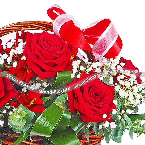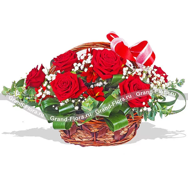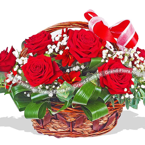 Стандартный: роза красная (50 см) - 5 шт., альстромерия красная - 2 шт., гипсофила - 3 шт., декоративная зелень, оазис, корзина малая, бант красный.