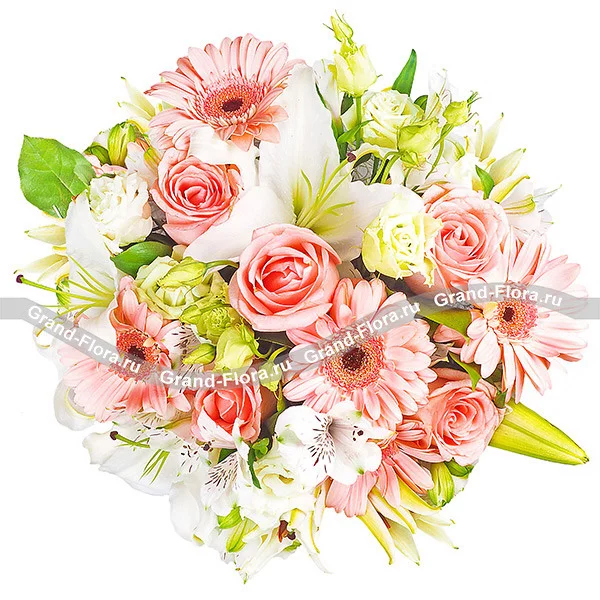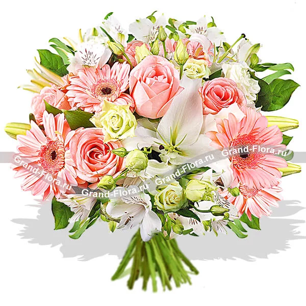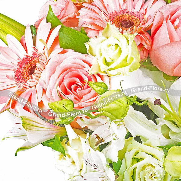 Отправьте своей половинке восхитительный букет из розовых гербер, роз, лилий и эустомы. Она оценит ваш вкус и шикарный поступок. Утонченный цветочный аромат создаст романтическую атмосферу, поднимет настроение, подарит желание творить и восхищаться. В качестве декора использована дизайнерская бумага, в которую и упакован букетик.