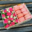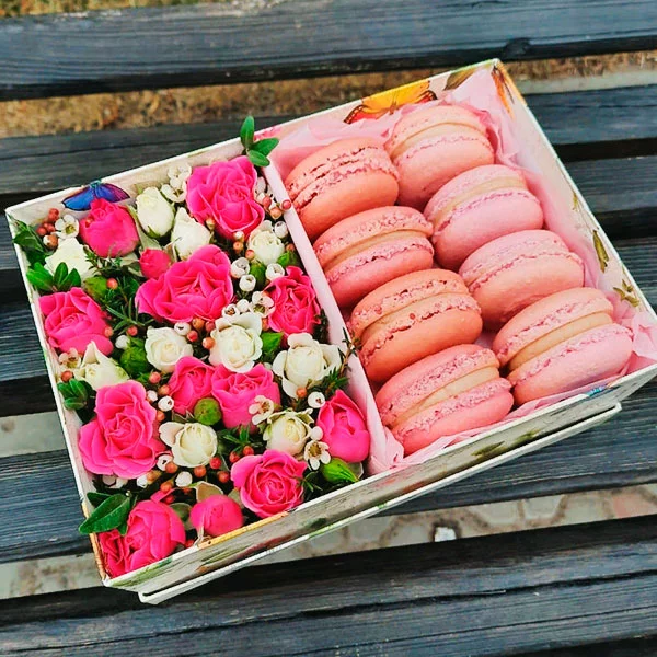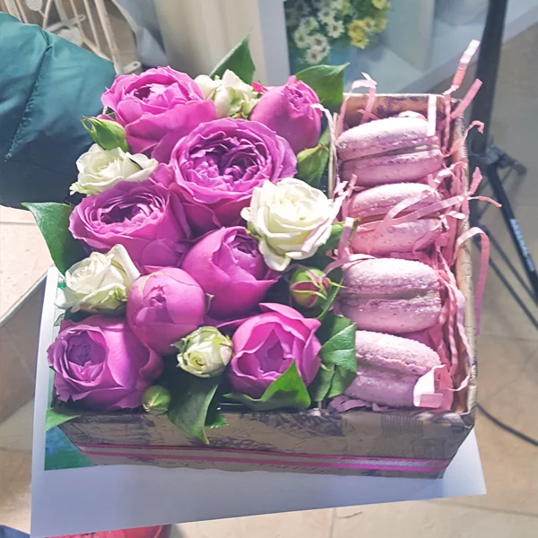 Доставка данной композиции возможна только по России! Возможна замена макарунов на зефир или конфеты Raffaello. Дизайн коробки может отличаться от картинки! Просим оформлять данный вид композиции заранее