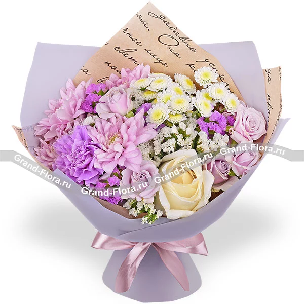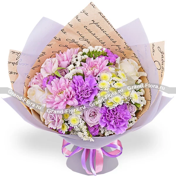 Люкс: роза белая - 3 шт., роза кустовая фиолетовая - 2 шт., гвоздика фиолетовая - 4 шт., хризантема сантини - 2 шт., хризантема кустовая ромашковая фиолетовая - 4 шт., статица, упаковка, лента. Примерный размер: 40Х40 см.
