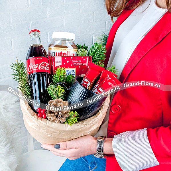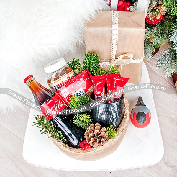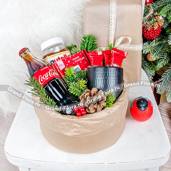 Стандартный: Coca-Cola - 0,33 мл., шоколад "Ritter Sport" - 1 шт., шоколадная паста "Nutella" - 180 гр., шоколад "Kitkat" - 3 шт., кружка* - 1 шт., шишка - 1 шт., ель, декор, коробка.